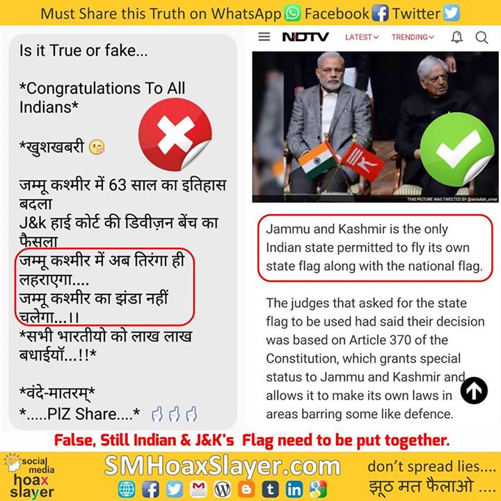 Source: http://m.ndtv.com/india-news/two-flags-for-jammu-and-kashmir-stopped-for-now-by-court-1261301 https://www.facebook.com/SMHoaxSlayer/photos/a.147357335599672.1073741828.140690692933003/355889824746421/?type=3