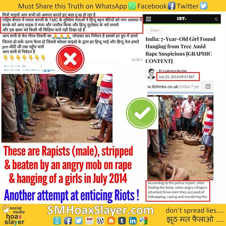 TRUTH: http://www.ibtimes.co.uk/india-7-year-old-girl-found-hanging-tree-amid-rape-suspicions-graphic-content-1458253 https://www.facebook.com/SMHoaxSlayer/photos/a.147357335599672.1073741828.140690692933003/374598532875550/?type=3