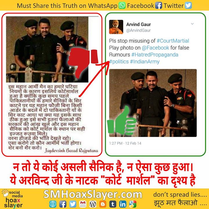 न तो ये असली सैनिक है, न ऐसा कुछ हुआ। ये @ArvindGaur जी के नाटक “कोर्ट मार्शल” का दृश्य है।