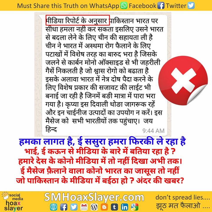 ई मैसेज फ़ैलाने वाला कोनो भारत का जासूस तो नहीं जो पाकिस्तान के मीडिया में बईठा हो ? अंदर की खबर? https://www.facebook.com/SMHoaxSlayer/photos/a.147357335599672.1073741828.140690692933003/355922958076441/?type=3