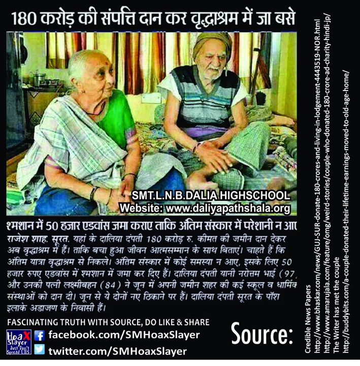 They Donated land woth 180 crores for educational purpose which now is a school in their name – Smt. L.N.B. Dalia High School and moved to Old Age Home, Deposited Rs. 50000 with Shamshan (Crematory) for proper ending.