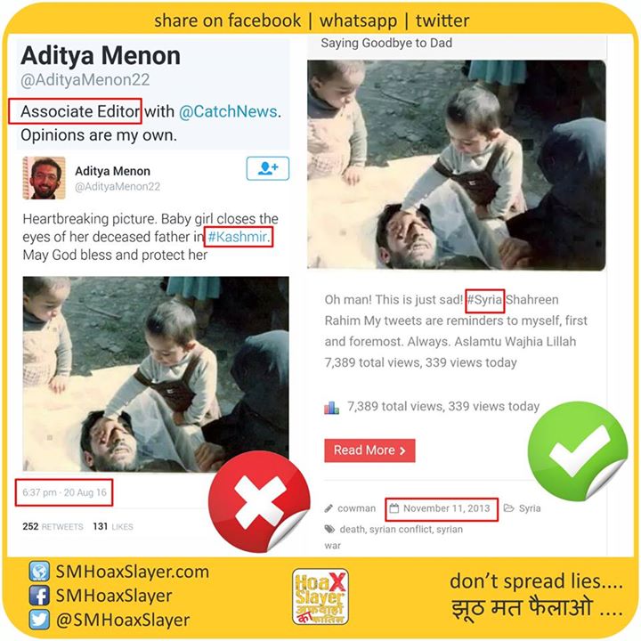 A Old Photo tweeted by @AdityaMenon22(A so-called Journalist) of #Syria is posted as latest from #Kashmir https://www.facebook.com/SMHoaxSlayer/photos/a.147357335599672.1073741828.140690692933003/331730627162341/?type=3