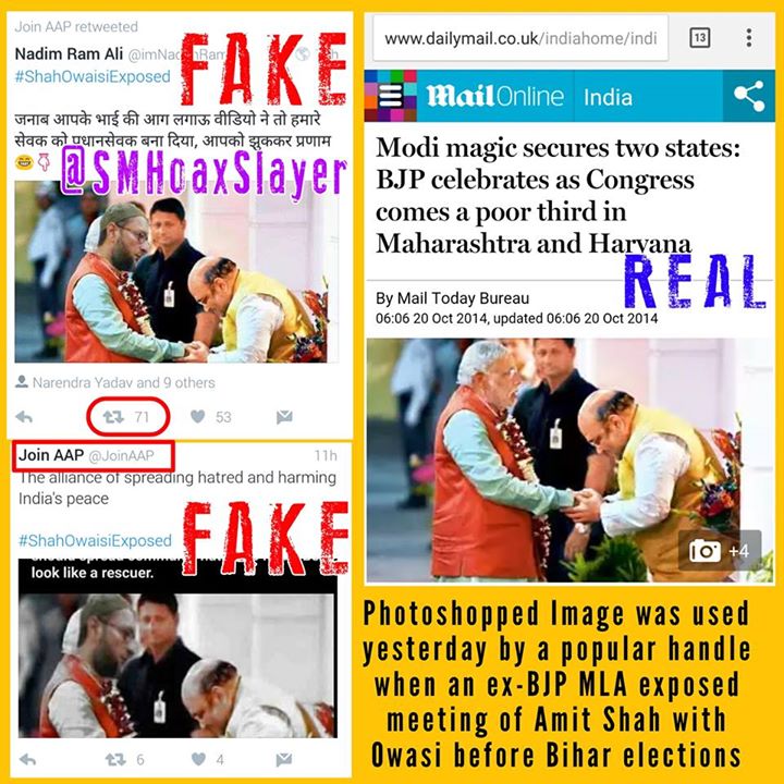 A Photoshopped Image was used yesterday by a popular handle @JoinAAP when an ex-BJP MLA exposed meeting of Amit Shah with Owasi before Bihar elections