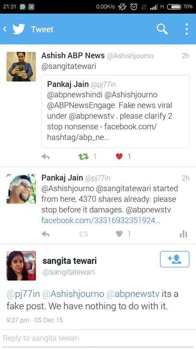 A reply from ABP journalist about the previous fake post. So pls dont click on forward/share blindly http://ift.tt/1liOmiU