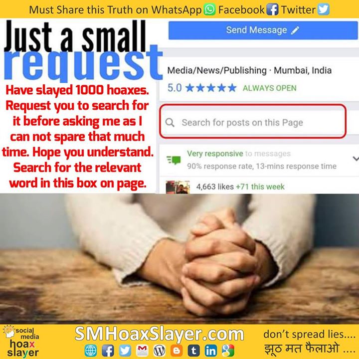 A small request. Already around 1000 hoaxes have been slayed on this page. Get queries for the ones which has been slayed already & not being able to reply to it calls for “sala jawaab bhi nahi deta”. So please search for the relevant name, word on page or website before asking me. I guess you understand it’s difficult to reply to all.