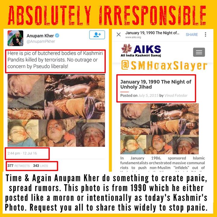 ABSOLUTELY IRRESPONSIBLE Mr. @AnupamPkher This photo is from 1990 which he either posted like a moron or intentionally as today’s Kashmir’s Photo. Request you all to share this widely to stop panic.