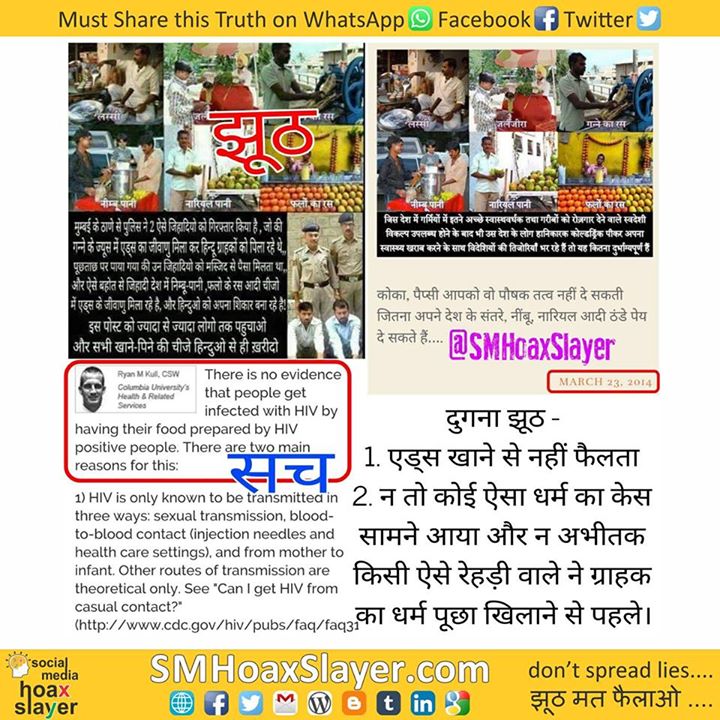 एड्स खाने से नहीं फैलता – http://www.thebody.com/Forums/AIDS/SafeSex/Q95033.html https://www.facebook.com/SMHoaxSlayer/photos/a.147357335599672.1073741828.140690692933003/370866279915442/?type=3