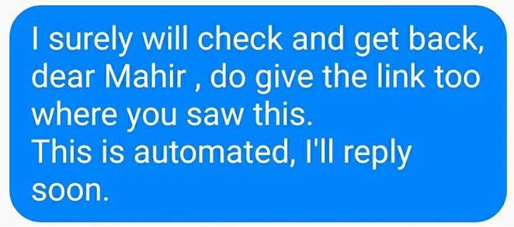 This is automated. I check your query/message ASAP and then reply on my own. आदरणीय गूगल चचा से पूछने में वक्त लगता है। https://www.facebook.com/SMHoaxSlayer/photos/a.147357335599672.1073741828.140690692933003/371241476544589/?type=3