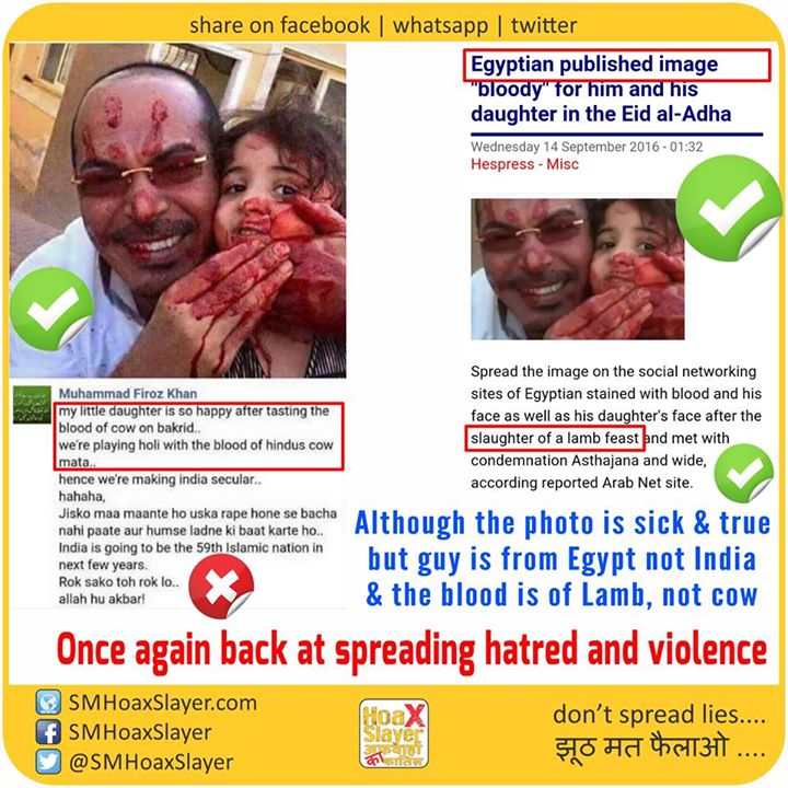 As usual people back again in enticing hate & Violence. Although the photo is sick & true but guy is from Egypt not India & the blood is of Lamb, not Cow