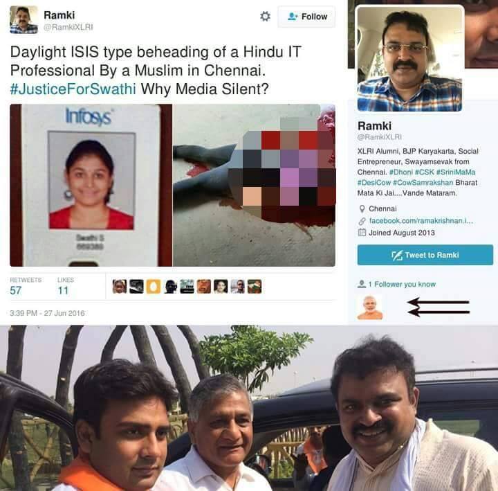 This man is spreading dangerous rumours on Twitter about the religious identity of the person who was involved in the dastardly murder at the Chennai railway station. While police has not said anything to this effect, these rumours are being spread by many right wing twitter handles and websites to invoke communal hatred. Not surprisingly, he is followed by Narendra Modi on Twitter and has pictures with Gen VK Singh.