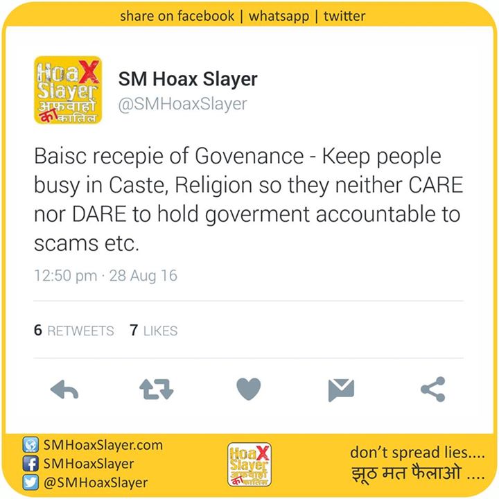 Baisc recepie of #Governance from #Decades – Keep people busy in Caste, Religion so they neither CARE nor DARE to hold goverment accountable to scams etc. https://www.facebook.com/SMHoaxSlayer/photos/a.147357335599672.1073741828.140690692933003/336062240062513/?type=3