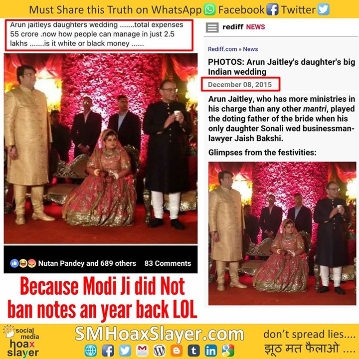 Source: http://m.rediff.com/news/report/pix-check-out-who-turned-up-for-arun-jaitleys-daughters-wedding/20151208.htm https://www.facebook.com/SMHoaxSlayer/photos/a.147357335599672.1073741828.140690692933003/382969468705123/?type=3
