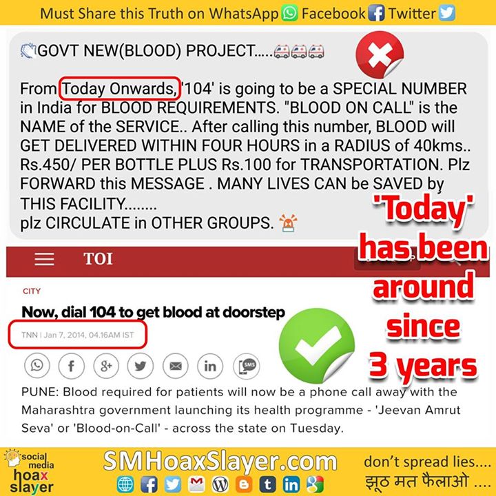 “Blood on Call 104” was started in ‘Jan 2014’ but ever since has been viral on WhatsApp as “Today” https://www.facebook.com/SMHoaxSlayer/photos/a.147357335599672.1073741828.140690692933003/371266013208802/?type=3