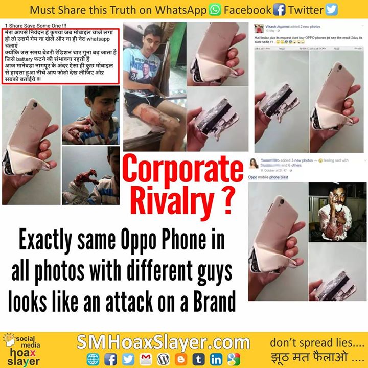 #BrandDefamation conspiracy ? Exactly same @Oppo @oppomobileindia mobile in all photos with different hurt guys looks like an attack on this Brand by rivals.