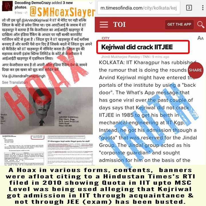 BREAKING: Just In – A Hoax that @ArvindKejriwal got in IIT through acq & not thu JEE is busted. It was viral citing to @htTweets ’s RTI filed in 2010 showing Quota in IIT upto MSC Level. This was being used to spread lie. He did crack IIT JEE