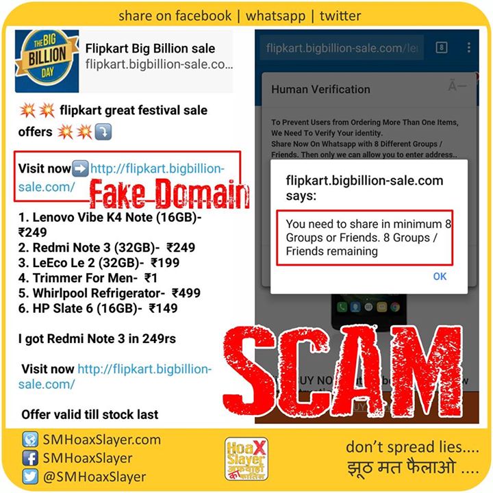 #Breaking #Scam #Flipkart #Sale @flipkart Fake Domain created onky to get your mobile numbers for database to be sold for telemarketing. Don’t fall for it. https://www.facebook.com/SMHoaxSlayer/photos/a.147357335599672.1073741828.140690692933003/352474558421281/?type=3