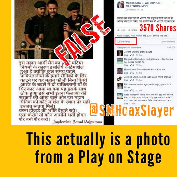 HOAX- An Indian Soldier beheaded 2 Pakistani Soldiers without Order from Seniors, so was Court Martial. Spread this like fire to make him a Hero.
