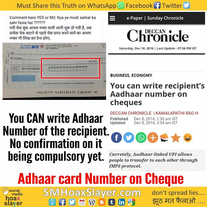 2. http://wap.business-standard.com/article/economy-policy/coming-soon-no-cheques-without-aadhaar-details-116120800298_1.html https://www.facebook.com/SMHoaxSlayer/photos/a.147357335599672.1073741828.140690692933003/389549854713751/?type=3