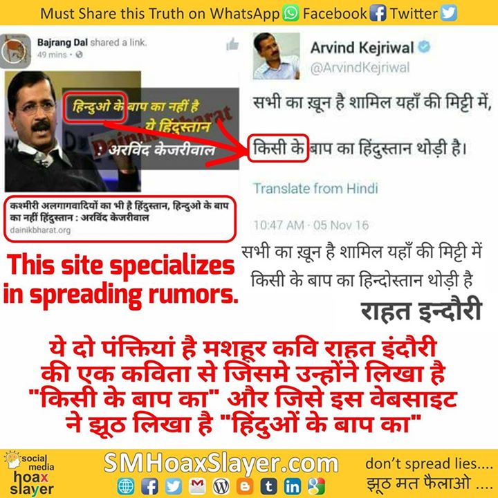 dainikbharat.org का कहना है कि @ArvindKejriwal ने कहा “हिंदुओं के बाप का हिंदुस्तान नहीं है” जबकि ये दो पंक्तियां है मशहूर कवि राहत इंदौरी की एक कविता से जिसमे उन्होंने लिखा है “किसी के बाप का” और जिसे इस वेबसाइट ने झूठ लिखा है “हिंदुओं के बाप का”