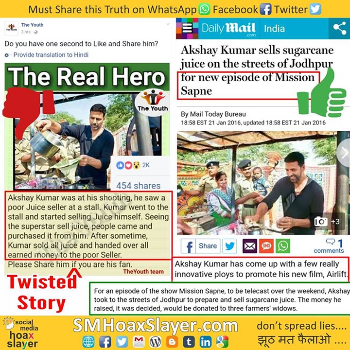2. http://www.dailymail.co.uk/indiahome/indianews/article-3410714/Akshay-Kumar-sells-sugarcane-juice-streets-Jodhpur-new-episode-Mission-Sapne.html https://www.facebook.com/SMHoaxSlayer/photos/a.147357335599672.1073741828.140690692933003/414965462172190/?type=3