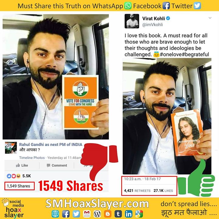 Truth: https://mobile.twitter.com/imVkohli/status/832815255755640832 https://www.facebook.com/SMHoaxSlayer/photos/a.147357335599672.1073741828.140690692933003/428781904123879/?type=3