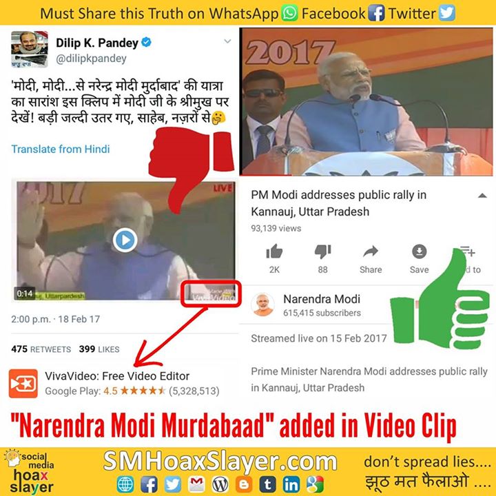 An edited video is getting Viral where “Narendra Modi Murdabaad” is added on his latest speech in Kannauj, UP, using Android App “Viva Video”