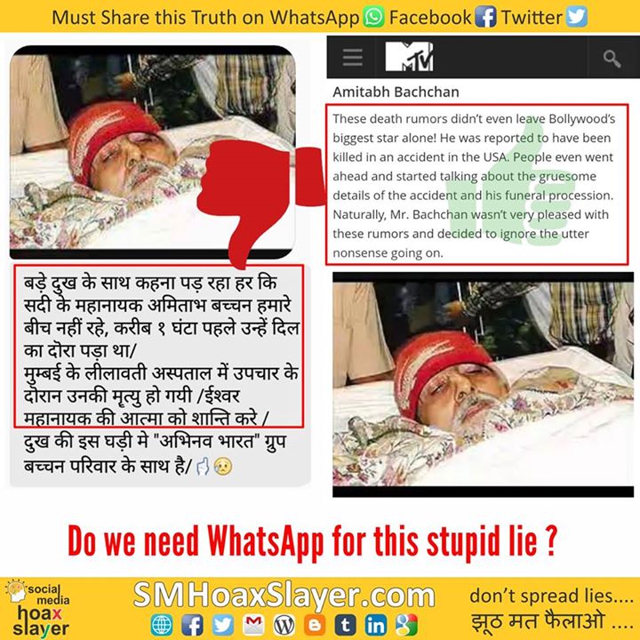 List of fake death hoaxes: http://www.mtvindia.com/blogs/parent/news/7-fake-bollywood-celebrity-death-rumours-that-scared-us-52196402.html https://www.facebook.com/SMHoaxSlayer/photos/a.147357335599672.1073741828.140690692933003/409262046075865/?type=3