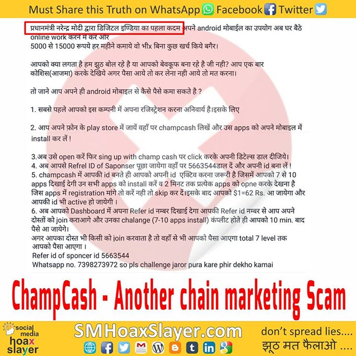 Don’t fall for it. Just another chain marketing Scam #ChampCash https://www.facebook.com/SMHoaxSlayer/photos/a.147357335599672.1073741828.140690692933003/368487273486676/?type=3