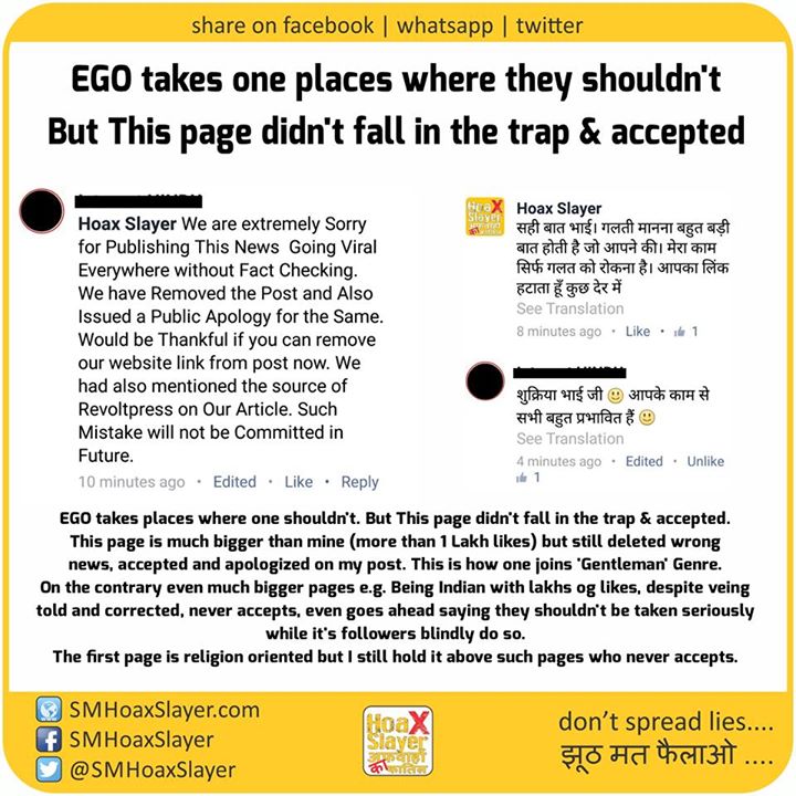 On the contrary even bigger pages e.g. Being Indian with lakhs og likes, despite veing told and corrected, never accepts, even goes ahead saying they shouldn’t be taken seriously while it’s followers blindly do so.