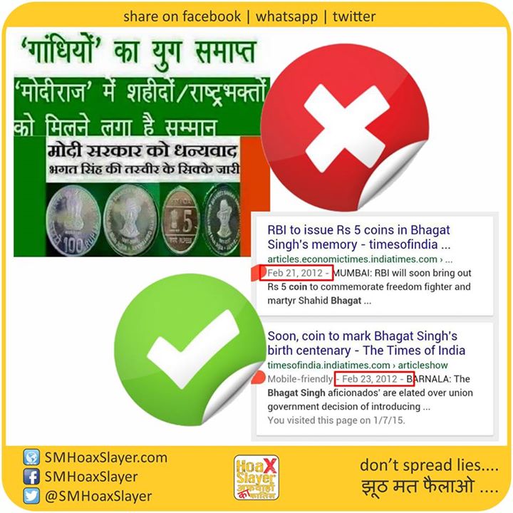 Many are forwarding this as Modi Government has started coins wiyh Bhagat Singh on it. While this is a rare collectible coin by Manmohan Singh Government. check the dates – 2012 https://www.facebook.com/SMHoaxSlayer/photos/a.147357335599672.1073741828.140690692933003/351961358472601/?type=3