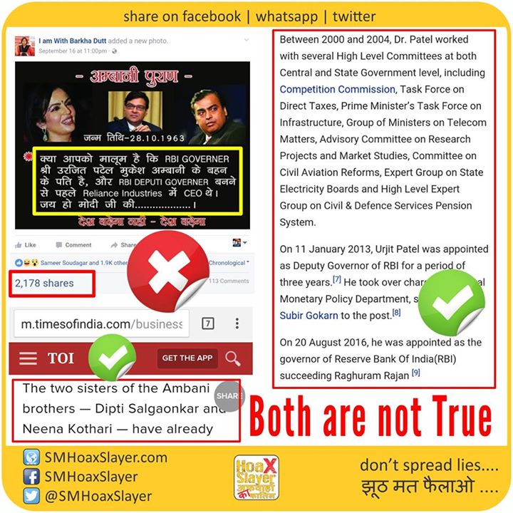 #False Neither Current RBI Gov was CEO of Reliance, Nor his wife is Mukesh Ambani’s Sister. And Fake news got 2178 Shares LOL https://www.facebook.com/SMHoaxSlayer/photos/a.147357335599672.1073741828.140690692933003/347511208917616/?type=3