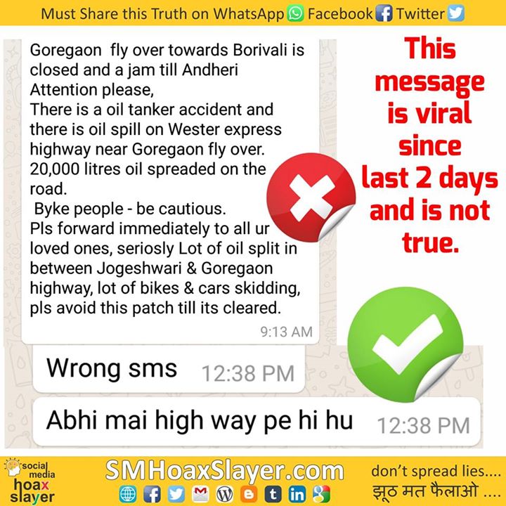 False Viral Message – Taker accident, Oil spill on Goregaon flyover towards Borivali https://www.facebook.com/SMHoaxSlayer/photos/a.147357335599672.1073741828.140690692933003/359670967701640/?type=3