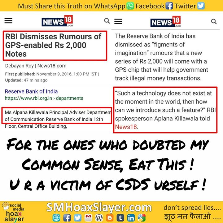 Source: http://www.news18.com/news/tech/rbi-dismisses-rumours-of-gps-enabled-rs-2000-notes-1310033.html https://www.facebook.com/SMHoaxSlayer/photos/a.147357335599672.1073741828.140690692933003/374218736246863/?type=3