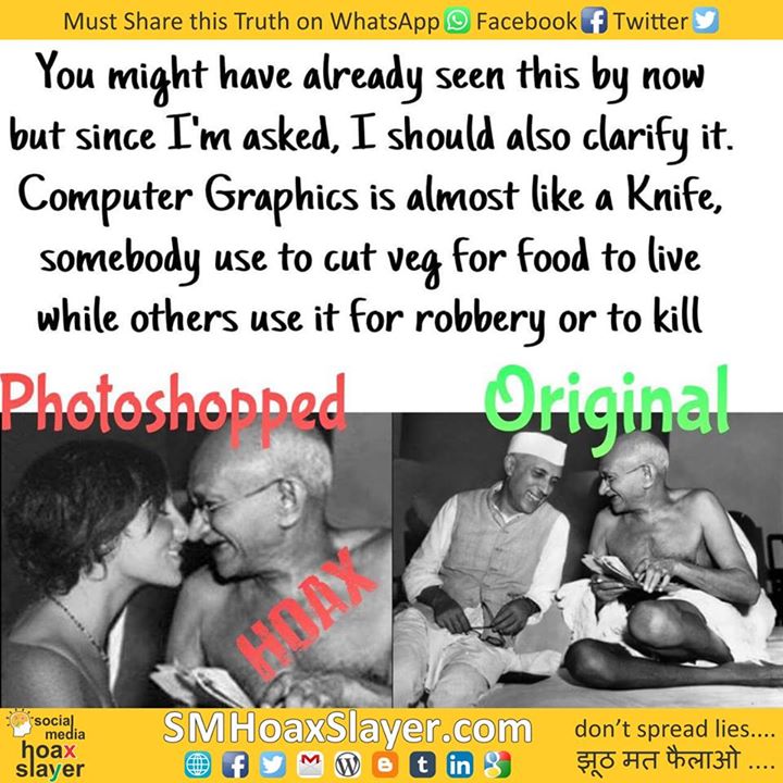 TRUTH: Two diff images have been Photoshopped, in original Mahatma Gandhi was sitting with Jawaharlal Nehru having a laugh.
