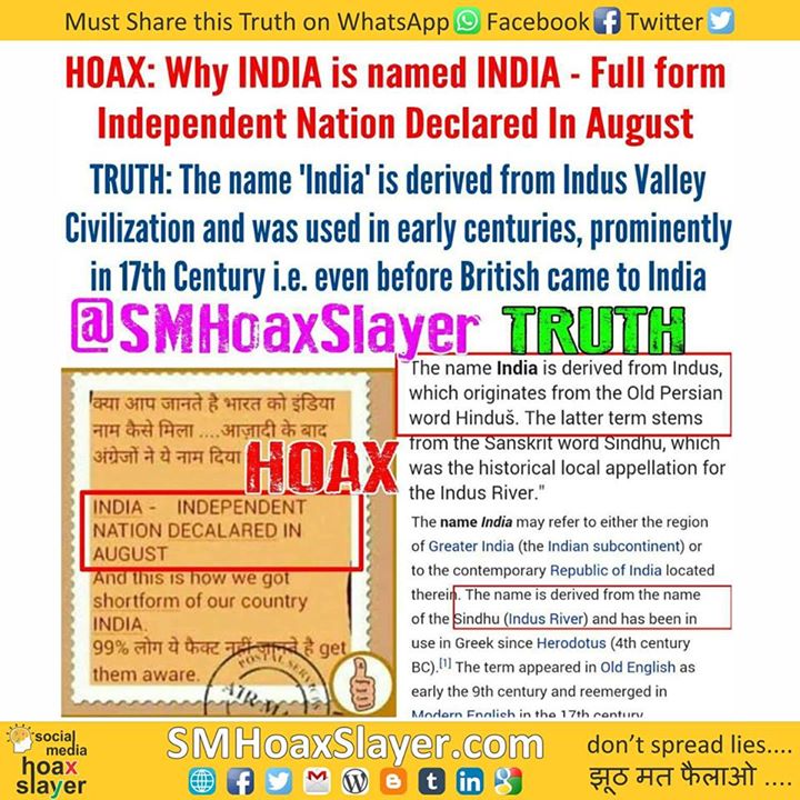 HOAX: 1. #India is #acronym for “ #Independent #Nation #Declared In #August ”
