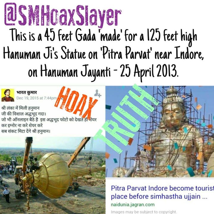 TRUTH: Such desperate r the times when I need to explain such idiotic Hoax while people r sharing it 🙁 This is a 45 feet Gada ‘made’ for a 125 feet high Hanuman Ji’s Statue on ‘Pitra Parvat’ near Indore, on Hanuman Jayanti – 25 April 2013.