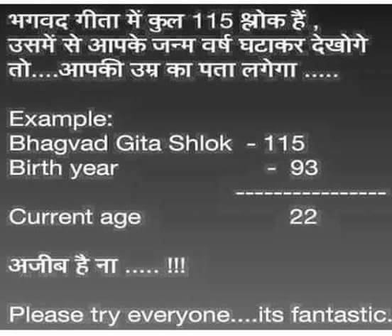 HOAX-Bhagwat Geeta has 115 Shlokas and if u deduct ur year of birth, u’ll get ur age.