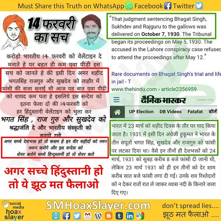Hoax: Every Year before Valentine’s Day false messages make rounds, some say Martyrs Bhagat Singh, Rajguru & Sukhdev were hanged on 14th Feb, some say the sentence was delivered on this day.