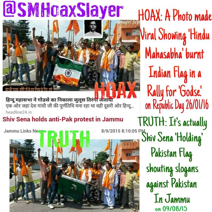 TRUTH: The Indian flag was photoshopped with flames on a Pakistan’s Flag which actually was hold by Shiv Sainiks protesting against Pakistan in Jammu in August 2015. The Site which posted it later deleted the news but it still 2nd on Google if you just type ’ hindu mahasabha burn tiranga’
