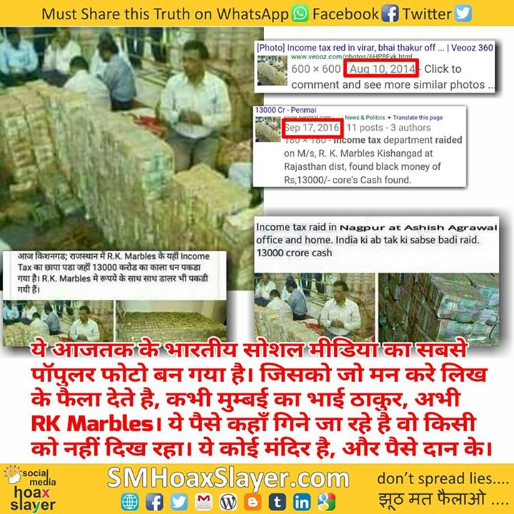 ये आजतक के भारतीय सोशल मीडिया का सबसे पॉपुलर फोटो बन गया है। जिसको जो मन करे लिखके फैला देते है, कभी मुम्बई का भाई ठाकुर, अभी RK Marbles। ये पैसे कहाँ गिने जा रहे है वो किसी को नहीं दिख रहा। ये कोई मंदिर है, और पैसे दान के। https://www.facebook.com/SMHoaxSlayer/photos/a.147357335599672.1073741828.140690692933003/376030276065709/?type=3