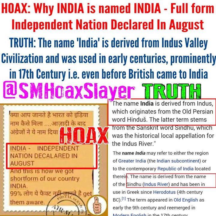 HOAX: #India is #named after #independence & is #acronym for “ #Independent #Nation #Declared In #August ”