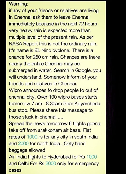 HOAX – NASA said El Nino Cyclone is about to hit Chennai and will drown entire city