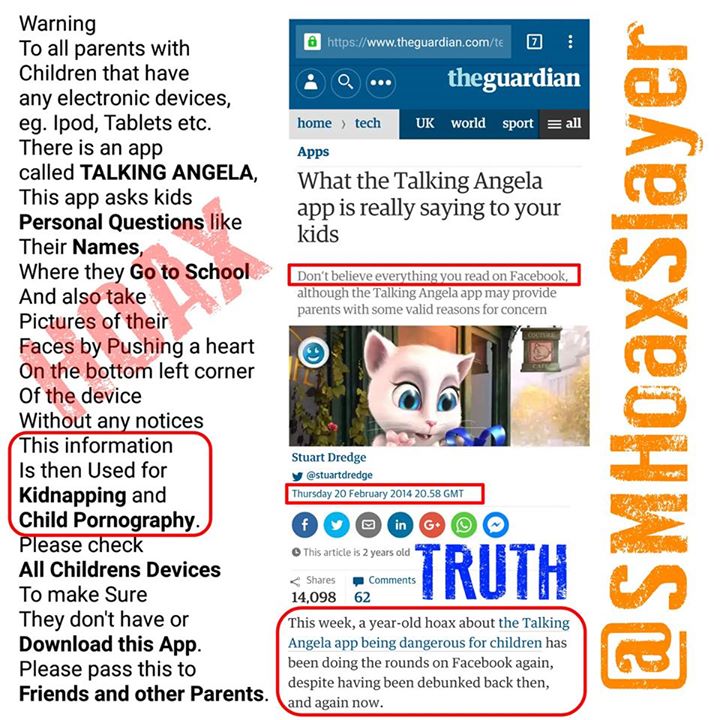 Source: https://www.theguardian.com/technology/2014/feb/18/talking-angela-app-children-safety https://www.facebook.com/SMHoaxSlayer/photos/a.147357335599672.1073741828.140690692933003/315880368747367/?type=3