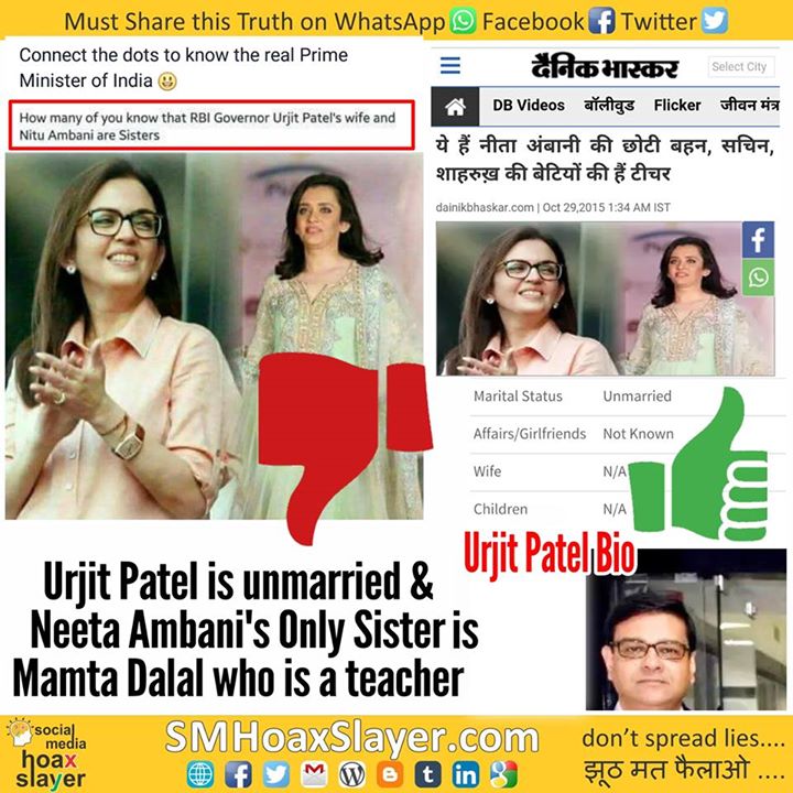 HOAX: Urjit Patel’s wife is sister of Neeta Ambani.
