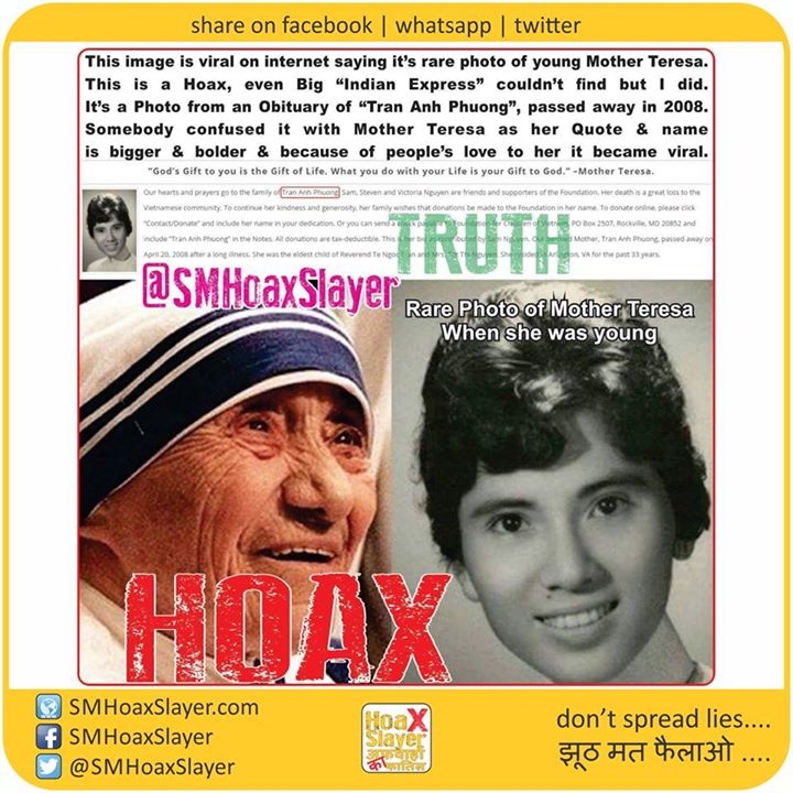 2. Indian Express’ Doubt: http://indianexpress.com/article/trending/mother-teresas-picture-of-her-youth-goes-viral/ https://www.facebook.com/SMHoaxSlayer/photos/a.147357335599672.1073741828.140690692933003/334979913504079/?type=3