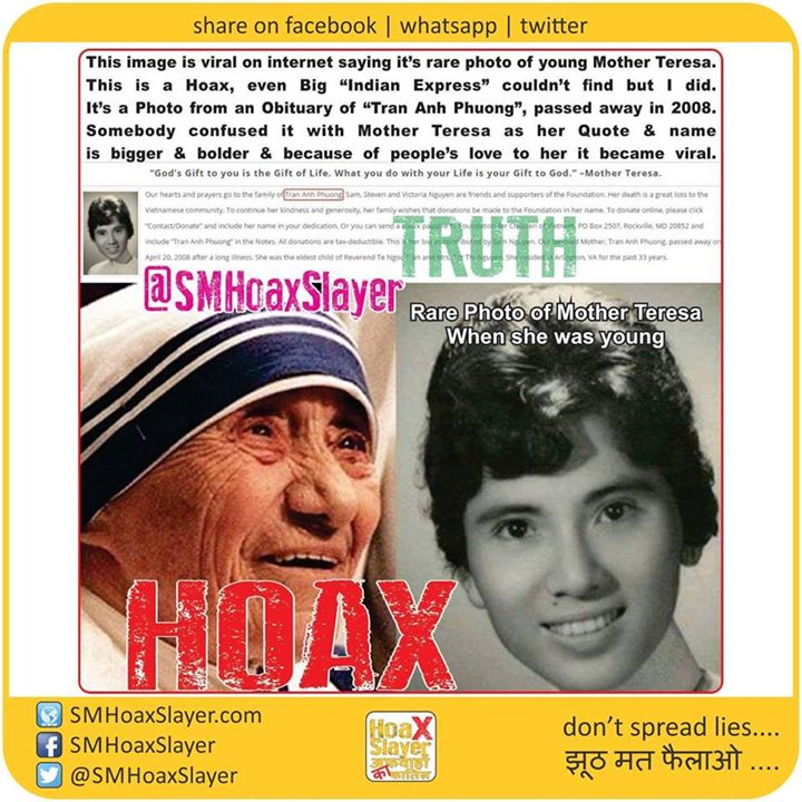 2. Indian Express’ Doubt: http://indianexpress.com/article/trending/mother-teresas-picture-of-her-youth-goes-viral/ https://www.facebook.com/SMHoaxSlayer/photos/a.147357335599672.1073741828.140690692933003/339963753005695/?type=3