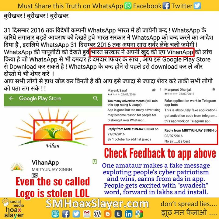 #Hoax – WhatsApp closing, VihanApp by GOI #FakeCyberPatriotism
