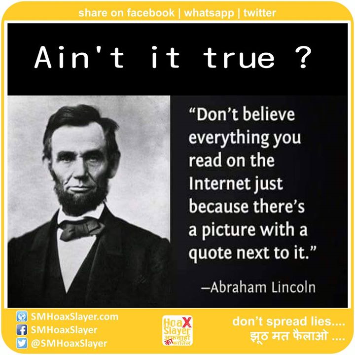 I Never met #Lincoln so can’t verify if he said this but what’s written is absolutely true. These days people put quote as per their view against a photo of Amitabh Bachhan, Sachin Tendulkar, JRDTata, Dalai Lama, APJ Azad etc. and many of you keep forwarding and sharing it https://www.facebook.com/SMHoaxSlayer/photos/a.147357335599672.1073741828.140690692933003/323539067981497/?type=3