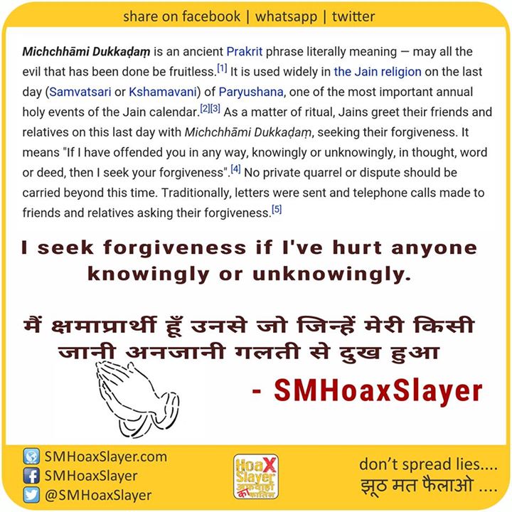 https://en.m.wikipedia.org/wiki/Micchami_Dukkadam https://www.facebook.com/SMHoaxSlayer/photos/a.147357335599672.1073741828.140690692933003/340505879618149/?type=3