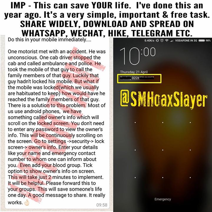 One motorist met with an accident. He was unconscious. One cab driver stopped the cab and called ambulance and police. He took the mobile of that guy to call the family members of that guy. Luckily that guy hadn’t locked his mobile. But what if the mobile was locked(which we usually are habituated to keep) how would have he reached the family members of that guy. There is a solution to this problem. Most of us use android phones, we have something called owner’s info which will scroll on the locked screen. You don’t need to enter any password to view the owner’s info. This will be continuously scrolling on the screen. Go to settings ->security-> lock screen-> owner’s info. Enter your details like your name and emergency contact number to whom one can inform about you. Even add your blood group. Tick option to show owner’s info on screen. This will take just 2 minutes to implement. It will be helpful. Please forward this to your groups. This will save someone’s life one day. A good message to share. It really works.👌🏻 http://ift.tt/1Sx5TTe